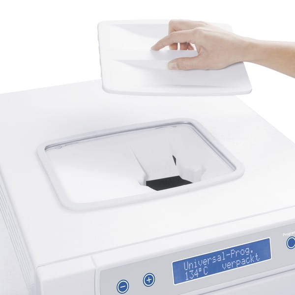 Přístroj má vnitřní paměť až pro 40 programových cyklů, což umožňuje přesnou dokumentaci provedených sterilizací. Součástí dodávky je držák zásobníku a kvalita zpracování na nejvyšší úrovni zaručuje, že výrobek je "Made in Germany".