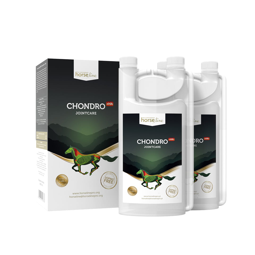 Chondro+HA 2 x 1000 ml HorseLinePRO je moderní specializovaný doplněk stravy speciálně vyvinutý pro koně na podporu zdraví kloubů a pojivových tkání. Hlavní složky, jako je glukosamin, chondroitin a kyselina hyaluronová, byly pečlivě vybrány tak, aby poskytovaly optimální podporu pohybového aparátu koní.