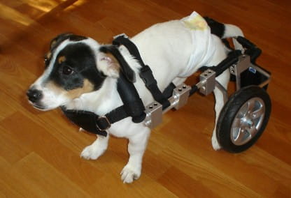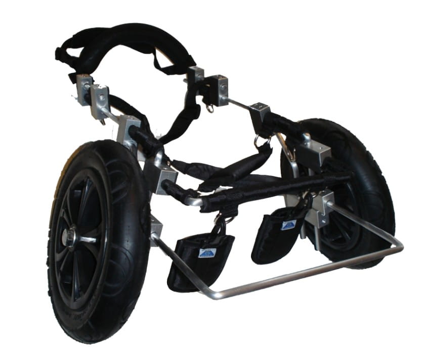 Nabízíme vám rehabilitační a invalidní vozíky pro psy a kočky. K jejich výrobě jsme použili lehký hliník. Vozíky jsou pro psy pohodlné a velmi snadno se používají. Díky použití speciálních nastavovacích aupínacích kostek je možné vozík snížit nebo prodloužit podle velikosti psa. V zadní části vozíku se používají měkké popruhy, které podpírají pánevní oblast psa. Vykloubené zadní končetiny, jsou zajištěny připínacími botičkami nebo, v případě malých plemen, speciálními páskami, které zabraňují poranění tlapek během jízdy. V oblasti předních končetin jsou dva nastavitelné popruhy, zajištěné měkkým obalem. V horní části vozíku, nad kohoutkem psa, je hřbetní pásek obalený houbou potaženou pleteninou. U velkých a obřích plemen psů je velmi důležité, aby všechny měkké části ve vozíku byly odnímatelné, manipulace s postiženým psem je pak snazší. Psa není třeba přenášet, abyste ho mohli umístit do vozíku. Stačí psa navést do rámu vozíku nebo naopak. Velmi důležitým bodem je konstrukce sklonu kol vůči zemi, díky které je kočárek stabilní a nepřevrací se v zatáčkách. Na jednom z níže uvedených videí můžete vidět, jak pes na kočárku (buldok) přejíždí poměrně značný kámen a bez potíží ho překonává, a to při vysokém sklonu kočárku. Vozíky jsou vyrobeny přibližně za 10 dní. Kočárek je možné vyzvednout osobně i se psem a na místě přesně namontovat (prosíme, zavolejte si o to předem). Kočárek je určen pro psy s problémy s pánevními končetinami, předpokladem pro použití tohoto kočárku je silná přední část psa. Pokud má pes problém i s přední částí, bude vyžadovat vozík 4. Pro správné změření psa použijte níže uvedené pokyny.