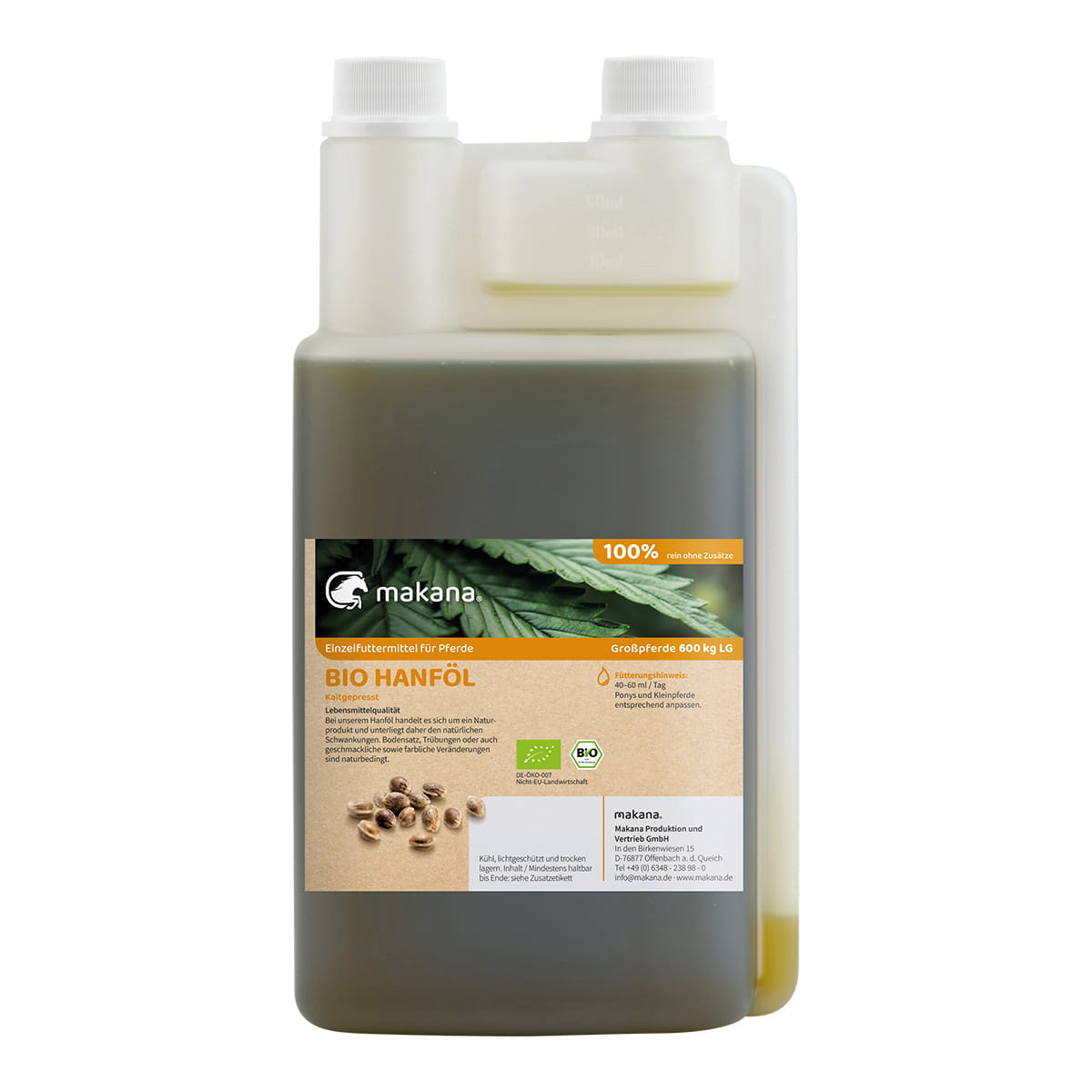 Hlavní vlastnosti a složení Makana konopného oleje lisovaného za studena 1 l pro zvířata: