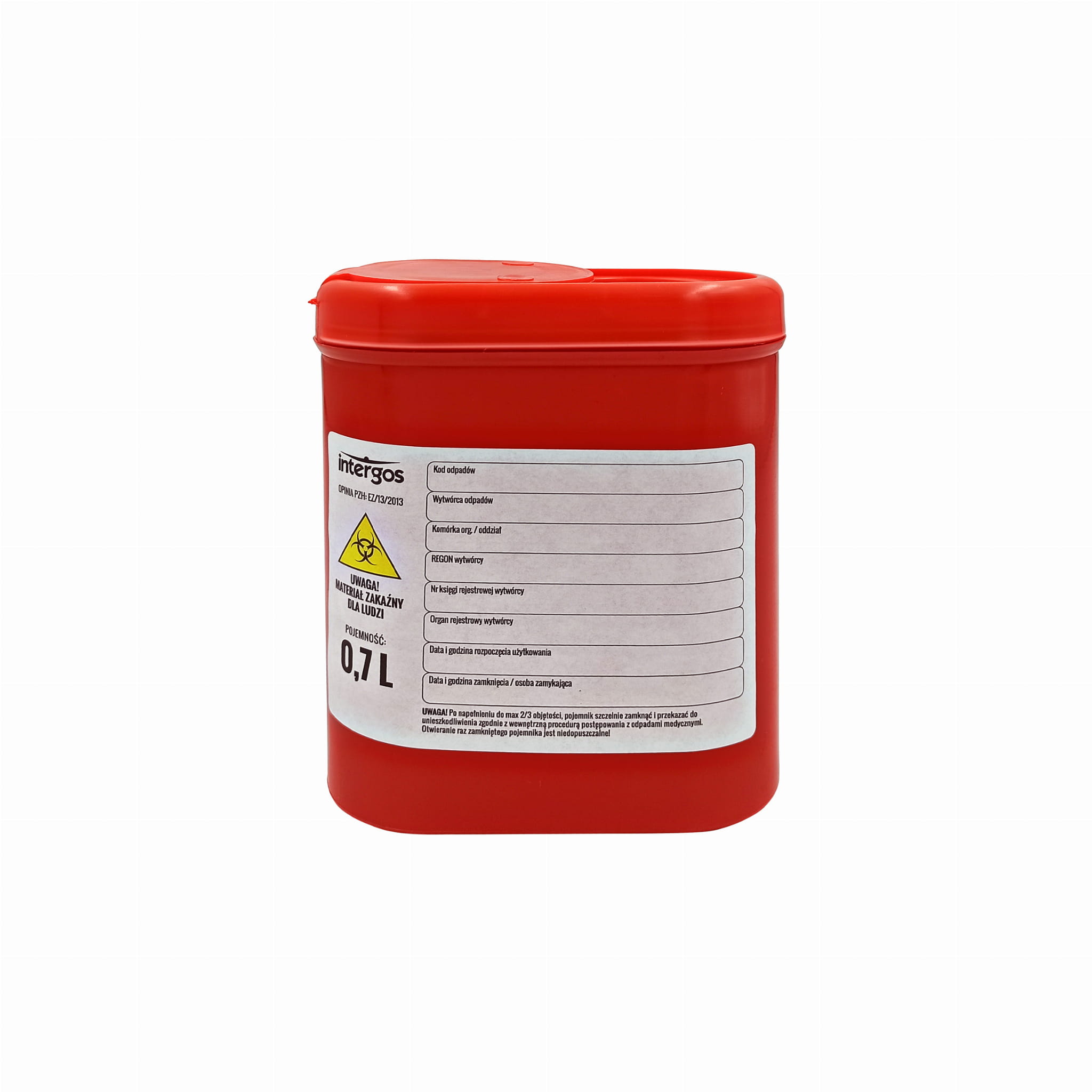 Červený kontejner na zdravotnický odpad je nepostradatelnou součástí vybavení veterinární ordinace. Kontejner slouží k dočasnému skladování odpadu, jako jsou obvazy, jehly, injekční stříkačky, pipety, nádoby na krev a malé části orgánů nebo těl, které představují riziko pro životní prostředí. Jakmile je kontejner zcela naplněn nebo dosáhl konce své životnosti, měl by být zapečetěn a poté předán k likvidaci příslušným orgánům. Doba použitelnosti kontejneru je maximálně 72 hodin. Kontejner má speciální systém, díky kterému je proces utěsnění nevratný.