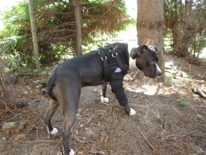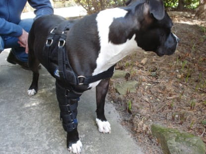 Ortéza je ušitá z nepromokavého materiálu typu kodura, vyplněná polyuretanovou pěnou a netkanou textilií, s podšívkou na vnitřní straně. Hliníkový mechanismus vetvaru kříže jeumístěn v tunelech umožňujících oddělené sejmutí vertikální a horizontální dlahy. Pokrývá přední tlapu psa včetně ramene, prochází hřbetem a břichem a zapíná se na suchý zip. Dlaha končí před loktem. Dále je pouze materiál, který svou tloušťkou dodává určitou tuhost, ale umožňuje ohnutí v loketním kloubu.