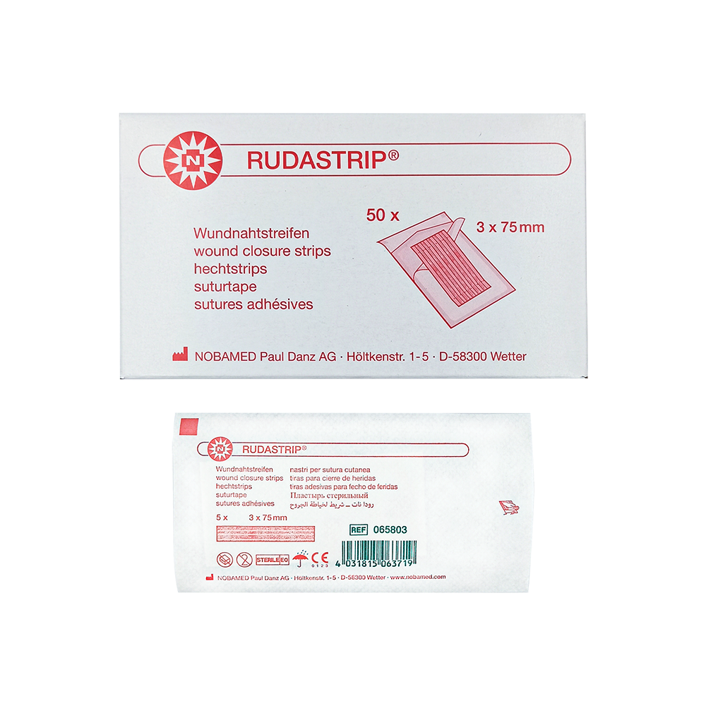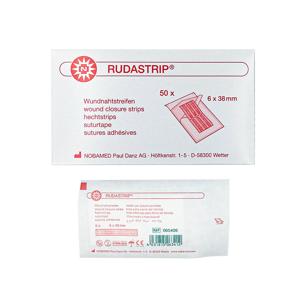 RUDASTRIP proužky pro uzávěr rány jsou samolepicí proužky, známé jako zevní stehy. Používají se k bezbolestnému uzavření malých řezných a drobných chirurgických ran. Výrobek je vyroben z odolné nylonové netkané textilie. Jsou tenké a pružné, tvarově se přizpůsobí ráně, nebrání pohybu a umožňují kůži dýchat. K použití jako samostatný obvaz nebo v kombinaci s chirurgickými stehy či sešívačkami.